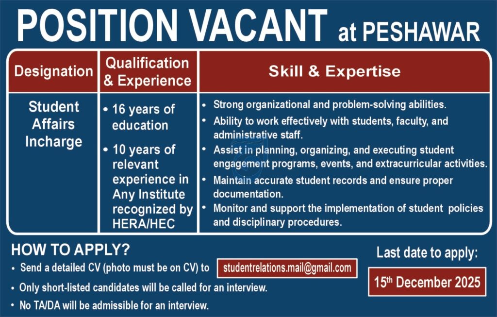 Peshawar University has issued an important announcement of a Student Affairs Incharge Vacancy at Peshawar. This executive-level position requires experience and visionary to oversee every facet of student experience ensuring an inclusive academic community for students… If you possess 10 years of relevant experience and 16 years of education… take this chance now…read more